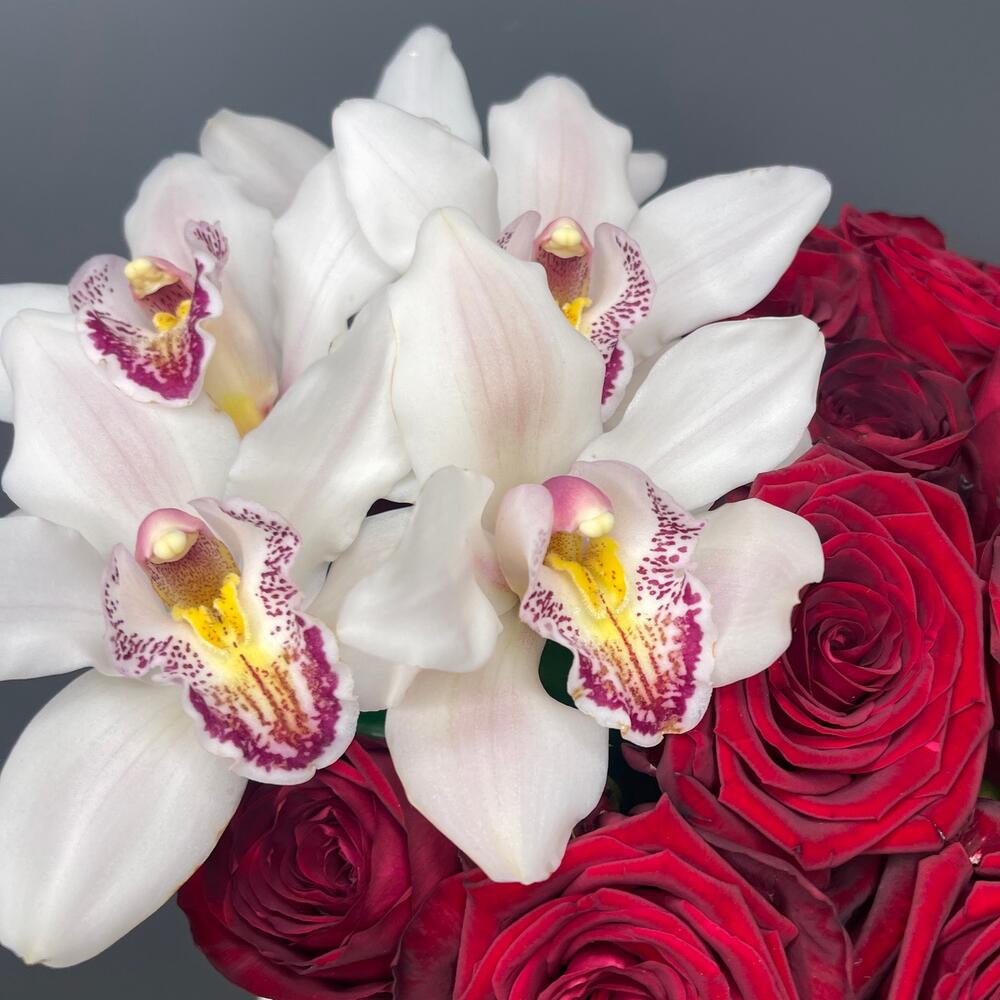 Стильная и элегантная композиция с ароматными розами и роскошной орхидеей в красно -черном тандеме